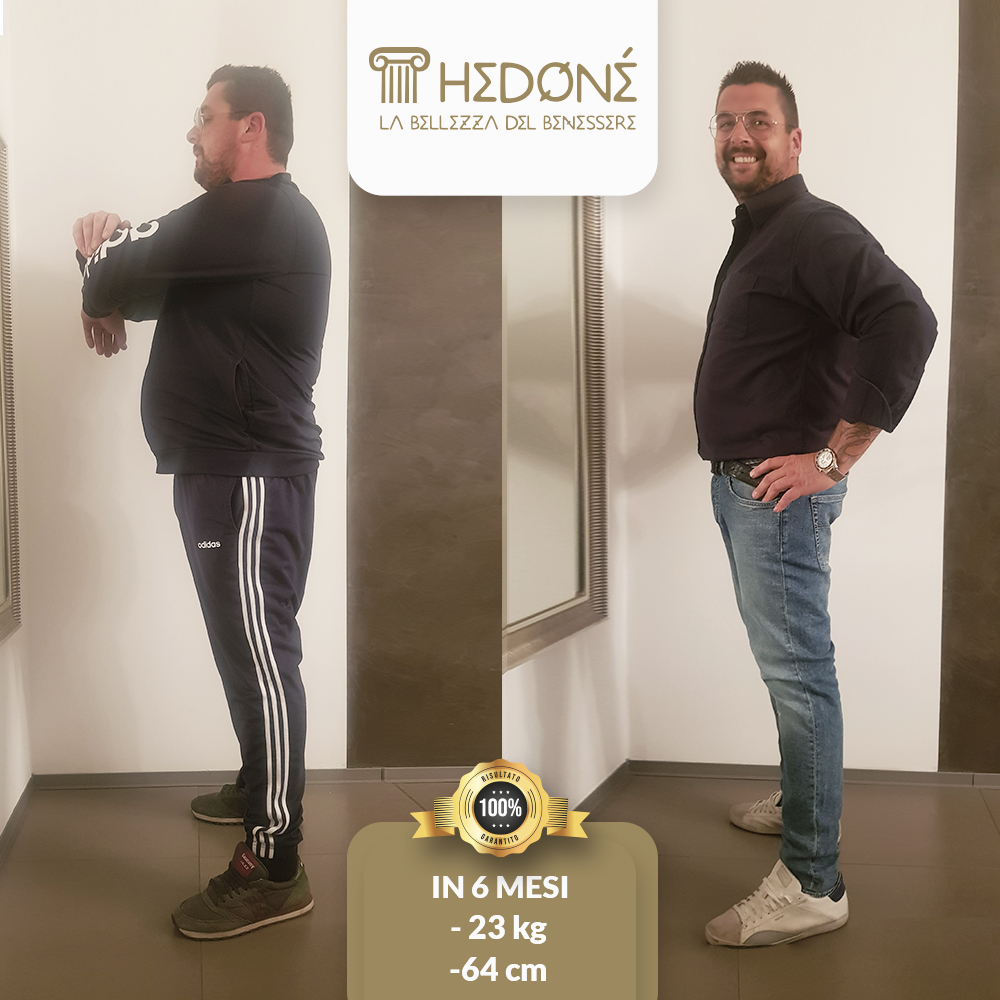 "Quando mi sono rivolto ad Hedoné avevo due obiettivi: dimagrire in tempo per la "prova costume" di Agosto e perseguire un risultato più a lungo termine con il mantenimento del peso raggiunto, riabituandomi allo stile di vita normale. Ho perso oltre 16 kg nei punti chiave ma, soprattutto, ho rimparato a volermi bene, a mangiare correttamente. Lo consiglio, soprattutto a quegli uomini che, come me, hanno bisogno di ripartire con l'ausilio di veri professionisti."